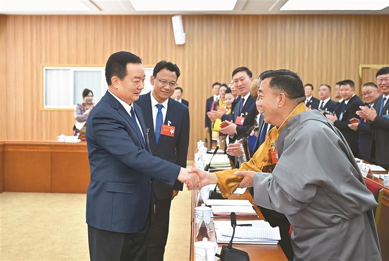 2月1日下午,自治區(qū)黨委書記王君正參加自治區(qū)十二屆人大四次會議阿里代表團審議。這是審議開始前,王君正與代表握手交談。本報記者 旦增西旦 攝