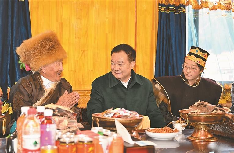 中華民族傳統(tǒng)節(jié)日春節(jié)剛過,雪域高原又迎來了藏歷新年初二,家家戶戶回蕩著“羅薩扎西德勒”的溫馨祝福。“過年了,祝你們新年快樂、身體健康、吉祥如意!”王君正走進(jìn)魯朗鎮(zhèn)扎西崗村77歲的老黨員、致富帶頭人平措家里,嶄新的香布、整潔的小院,切瑪斑斕、卡塞飄香,家里充滿濃濃的年味兒。“身體怎么樣?”“民宿生意好不好?”在暖意融融的客廳里,王君正和老人聊家常,詢問身體狀況及家庭收入等情況,隨后走進(jìn)平措家的民宿旅館,從價(jià)格、住宿條件到屋外山景,看得仔細(xì)、問得深入。了解到在以習(xí)近平同志為核心的黨中央親切關(guān)懷下,扎西崗村發(fā)生了翻天覆地的變化,平措一家借助本地旅游資源,開民宿、做餐飲,年收入不斷增加,日子越過越好,王君正為他們的發(fā)展感到由衷高興、為他們的幸福生活點(diǎn)贊。他說,“看著北斗星走不迷路、跟著共產(chǎn)黨走會(huì)幸福”,這些好日子,離不開以習(xí)近平同志為核心的黨中央對西藏工作的高度重視、對西藏各族人民的深切關(guān)懷,大家要感恩總書記、感謝黨中央,更加堅(jiān)定不移聽黨話、感黨恩、跟黨走;黨員要發(fā)揮先鋒模范作用,發(fā)揚(yáng)黨的光榮傳統(tǒng)和優(yōu)良作風(fēng),帶領(lǐng)村民用勤勞的雙手把家園建設(shè)得更加美好,把日子過得更加甜蜜。