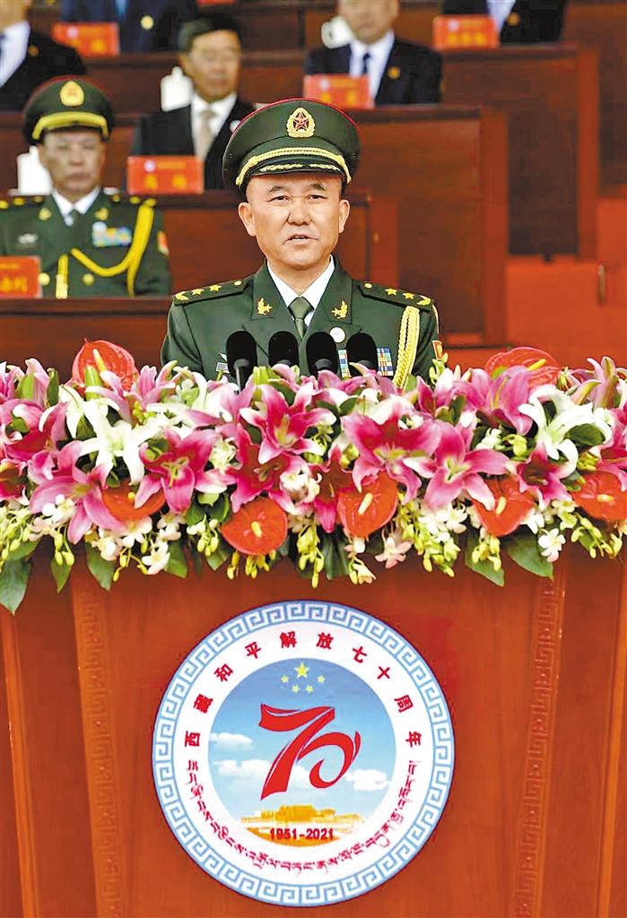 70年來(lái),我們進(jìn)行的一切奮斗、一切犧牲、一切創(chuàng)造,都是為了踐行我們黨的初心使命,為西藏謀發(fā)展,為人民謀幸福。站上歷史新起點(diǎn),奮進(jìn)偉大新時(shí)代。我們將始終堅(jiān)持以習(xí)近平新時(shí)代中國(guó)特色社會(huì)主義思想為指導(dǎo),按照習(xí)主席在藏考察時(shí)的重要指示精神,堅(jiān)定不移維護(hù)核心,增強(qiáng)“四個(gè)意識(shí)”、堅(jiān)定“四個(gè)自信”、做到“兩個(gè)維護(hù)”,貫徹軍委主席負(fù)責(zé)制,堅(jiān)決聽(tīng)習(xí)主席指揮、對(duì)習(xí)主席負(fù)責(zé)、讓習(xí)主席放心;堅(jiān)定不移強(qiáng)軍興軍,堅(jiān)決貫徹習(xí)近平強(qiáng)軍思想,全面推進(jìn)政治建軍、改革強(qiáng)軍、科技強(qiáng)軍、人才強(qiáng)軍、依法治軍,努力為建設(shè)世界一流軍隊(duì)而不懈奮斗;堅(jiān)定不移固邊穩(wěn)藏,全面加強(qiáng)練兵備戰(zhàn),維護(hù)社會(huì)大局穩(wěn)定,忠誠(chéng)衛(wèi)國(guó)戍邊,時(shí)刻枕戈待旦,確保召之即來(lái)、來(lái)之能戰(zhàn)、戰(zhàn)之必勝,堅(jiān)決當(dāng)好拱衛(wèi)祖國(guó)西南邊陲的堅(jiān)強(qiáng)柱石;堅(jiān)定不移賡續(xù)血脈,大力弘揚(yáng)偉大建黨精神和“老西藏精神”“兩路”精神,用心用情用力保護(hù)好、管理好、運(yùn)用好紅色資源,系統(tǒng)推進(jìn)“紅色工程”建設(shè),擦亮?xí)r代底色、激揚(yáng)紅色風(fēng)采,堅(jiān)決做到“缺氧不缺精神、艱苦不怕吃苦、海拔高境界更高”;堅(jiān)定不移踐行宗旨,全面貫徹新時(shí)代黨的治藏方略,義不容辭抓好穩(wěn)定、發(fā)展、生態(tài)、強(qiáng)邊四件大事,始終做人民信賴(lài)、人民擁護(hù)、人民熱愛(ài)的子弟兵,在新征程上奮力譜寫(xiě)西藏長(zhǎng)治久安和高質(zhì)量發(fā)展新篇章!請(qǐng)黨中央放心,請(qǐng)習(xí)主席放心,我們一定不負(fù)時(shí)代、不負(fù)韶華、不負(fù)使命!