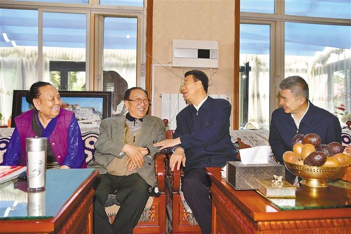 “七一”到來之際,吳英杰、莊嚴(yán)來到全國人大常委會原委員、全國人大民族委員會原副主任委員列確家中,關(guān)切詢問他生活和身體健康狀況,與他一起回顧黨的百年光輝歷程特別是西藏和平解放的歷史,展望西藏發(fā)展的美好前景。本報記者 旦增西旦 攝